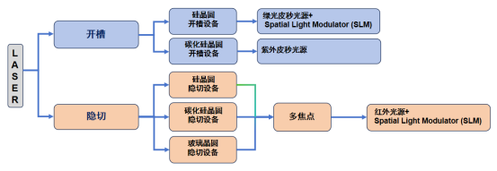 激光开槽设备-采用皮秒光源和SLM多焦点技术,实现减少热影响区,底部更平整,更高效率(速度是传统单焦点的1.5倍以上)和更高精度的开槽。(适用于Low-k 晶圆, LCD driver晶圆, 碳化硅, 氮化镓等产品)